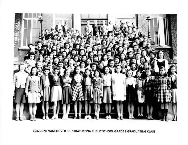 | description | The black and white image shows a large group of students lined up on the steps of a building, with teachers and administrators in the very back row. The image is of the grade eight graduating class at Strathcona Public School in Vancouver BC, and was taken in June 1942. The photograph was probably taken early since over 50% of the students were of Japanese ancestry and had to evacuate ninety miles from the coast as a security risk during the Second World War. Many of the individuals in this photograph have been identified. Note that only Japanese-Canadian students have been numbered and identified.
