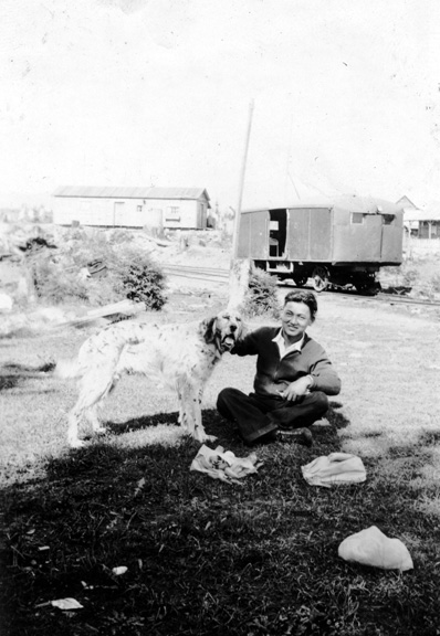 | description | An outdoor image of Mr. Takata sitting on a field of grass petting a large dog. There are unidentified buildings in background, railroad tracks in middle ground. Image is contemporaneous with item no. 83 above. Dog appears to be a Dalmation-Setter cross.