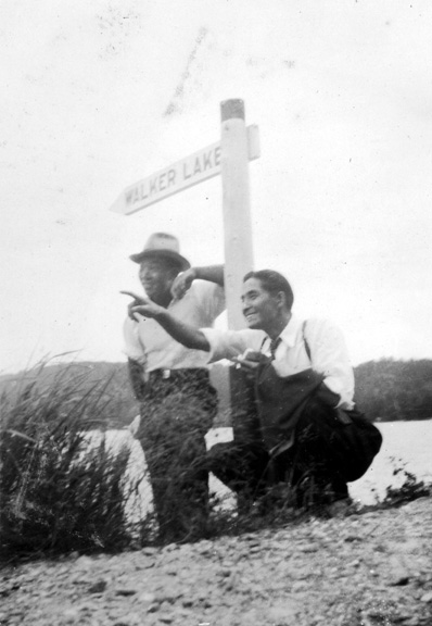 An outdoor image of two unidentified men next to sign post with Walker Lake in the background. Location may be Walker Lake near Ocean Falls, BC.