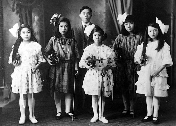 The image shows five girls all holding violins and bows in a studio. In the original album it reads, Takako Makita, Toyoko Hiramatsu, Yoshi Maikawa, Aki Nakamura and Unidentified. Behind them stands their teacher, Mr Watanabe.